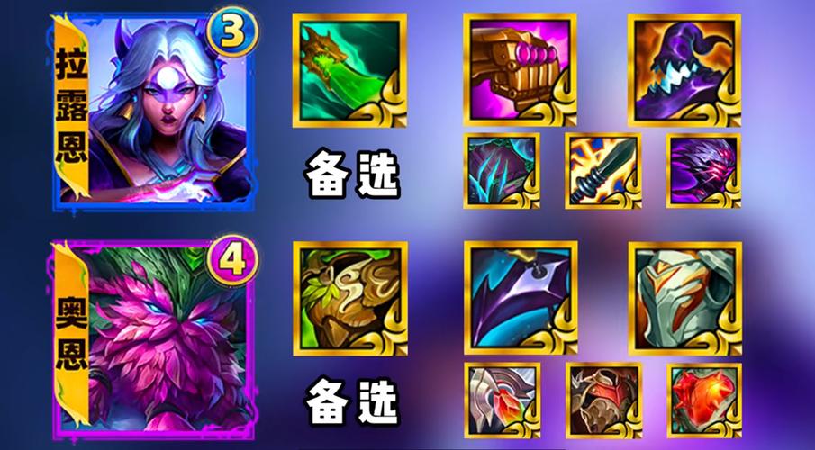 〖One〗、拉露恩:优先选取女神之泪、无用大棒、拳套,合成装备如蓝霸符(提升技能释放频率)、科技枪(提供吸血能力)、正义之手(增加输出或生存能力)。运营策略 前期过渡:可采用4夜幽+2神谕的过渡阵容,德莱厄斯可作为前期坦度担当。若拥有青龙刀,则推荐克格莫+狙神阵容过渡,因为二星克格莫的输出能力高于一星拉露恩。
