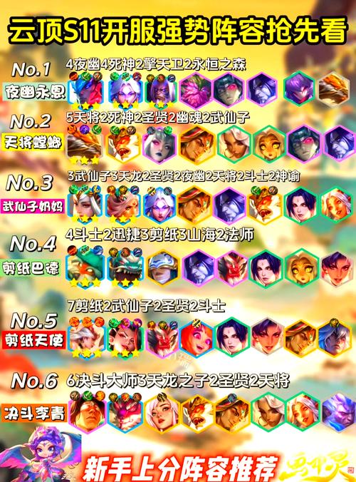 〖Two〗、云顶之弈S11赛季最强阵容推荐:狙神斗士阵容 核心成员:克格莫、凯特琳、赛娜、厄斐琉斯等。阵容特点:前排斗士抗伤,后排狙神输出。狙神转为6狙神最佳,若无则走四狙神体系。优势:输出稳定,前排坦度足够。七护卫两射手/五星弈子阵容 核心成员:纳尔、诺提勒斯、盖伦、贾克斯、霞、卡莎等。