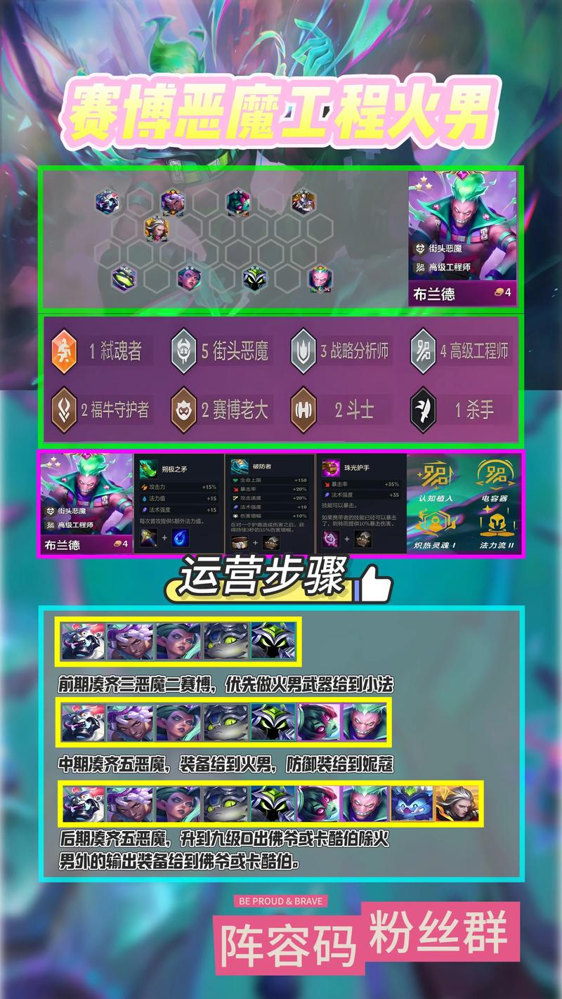 阵容组成 核心英雄:艾克、可酷伯、狮子狗、妮寇、盖伦、蒙多、火男、莎弥拉、婕拉。这九位英雄共同构成了七街头恶魔阵容。羁绊搭配 主要羁绊:7恶魔,提供强大的恶魔羁绊效果,增强阵容的输出能力。辅助羁绊:2斗士增加前排坦度,2战略提供额外的战斗加成,2工程则带来一定的功能性支持。