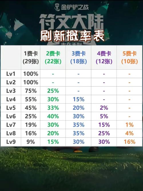 - 5级:45%为1费卡,33%为2费卡,20%为3费卡,2%为4费卡。- 6级:35%为1费卡,35%为2费卡,25%为3费卡,5%为4费卡。- 7级:22%为1费卡,35%为2费卡,30%为3费卡,12%为4费卡,1%为5费卡。