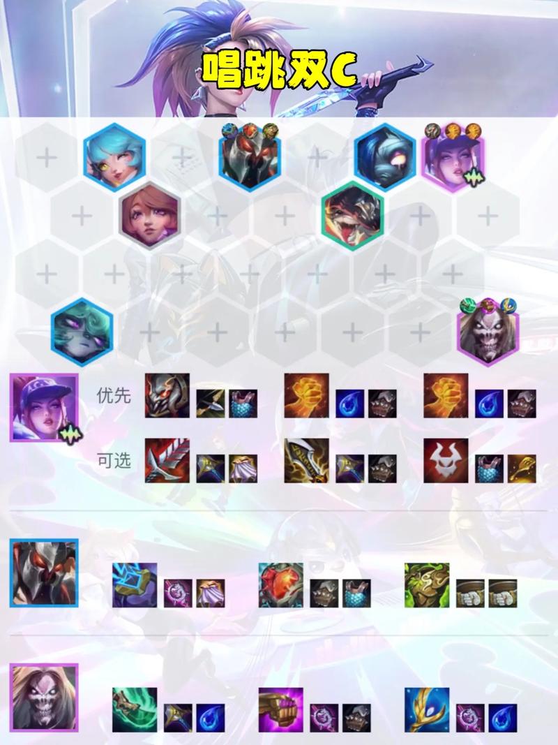该阵容拥有1猫猫、5辛迪加、4刺客、2战斗学院、2保镖和2学者羁绊。在前中期过渡阶段,需保证血量健康并快速拉8寻找阿卡丽。装备优先级如下图所示。站位方面,建议如图所示摆放。若未获得浪人海克斯,可采用密级站位。以上阵容在金铲铲之战中表现优异,可供玩家借鉴学习。希望每位玩家都能成为最强王者。