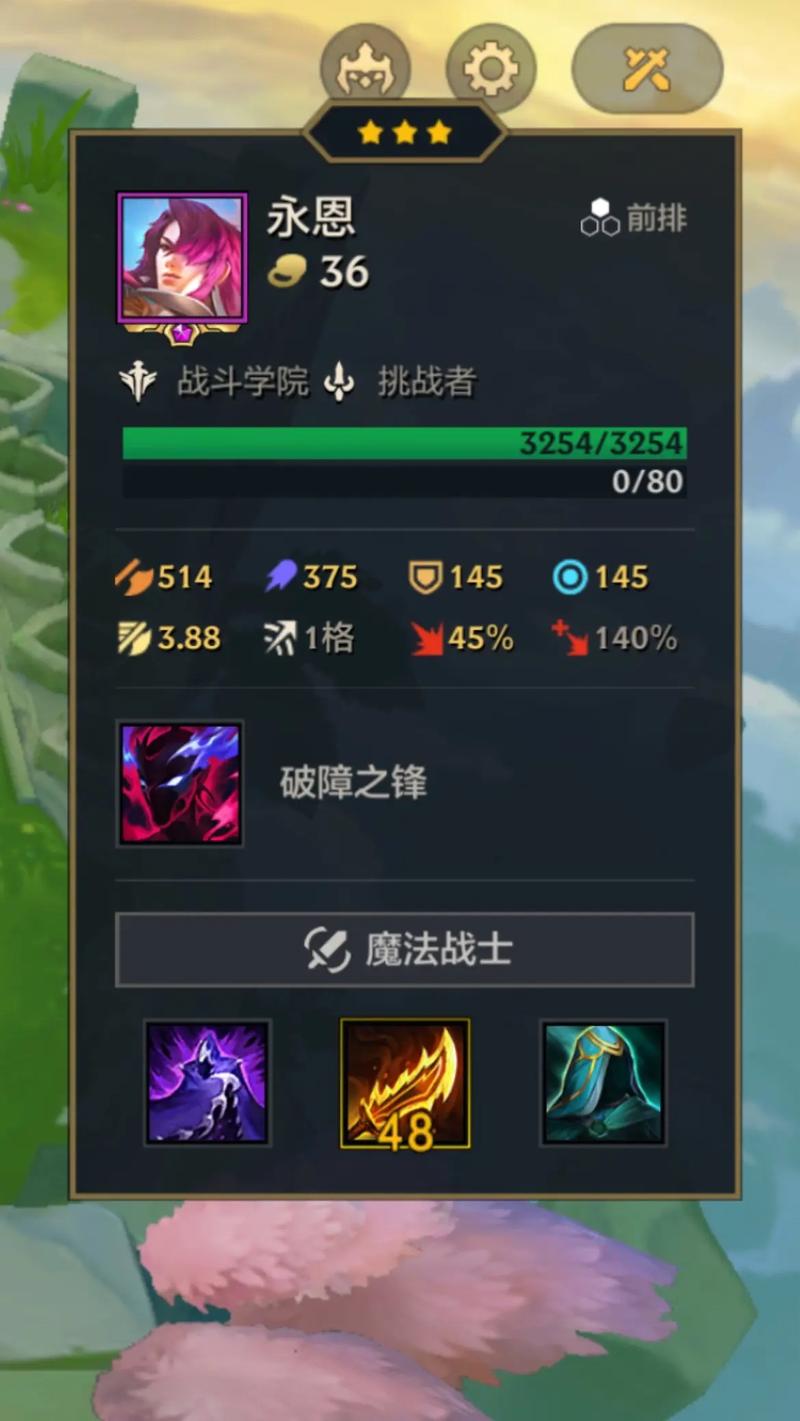 〖Four〗、金铲铲之战挑战永恩阵容推荐玩【新版挑战者永恩】6挑战3学院2保镖,具体攻略如下:棋子及羁绊如图所示:装备分析永恩的核心装备为分裂弓,优先级比较高,第二件推荐复活甲,最后一件补输出装,比较好的是轻语,其次无尽、泰坦、巨杀也可以替代。多余的防装给到布隆,法强装给卡莎,攻击装给剑姬。