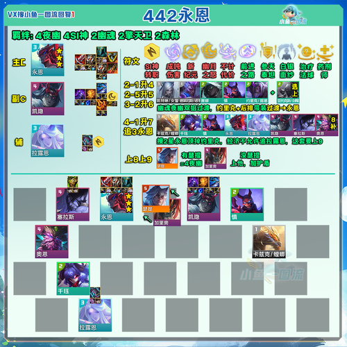至于慎和奥拉夫要看情况,如果血量不支、后期放弃上9级的话,也可以追3星,否则就只拿永恩和雪人。到4阶段左右,拿到3星永恩直接拉人口上7级。后期阵容 人马单独站一交,吃伤害趁早启动,慎贴在努努和奥拉夫之间。亚索避开人群,尽量打出单体R,永恩正对主C,加里奥放在角落。