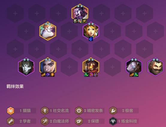悠米、永恩、菲欧娜、蕾欧娜、布隆、格林福斯、拉克丝、杰斯、卡特琳娜。羁绊组成:6/8战斗学院:提供额外的攻击力和法术强度,友方英雄施放技能时,战斗学院英雄获得额外加成。2保镖:拥有护甲提升,嘲讽邻格敌人。1猫猫:附身加护盾,每秒回复蓝量。2学者:所有盟友每2秒获得法力值。