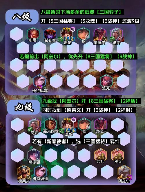 备选装备:泰坦的坚决、大帽子等,增强生存或输出能力。主T瑟庄妮:离子火花:削减敌方魔法抗性。救赎:提供范围伤害减免和生命回复。莫雷洛秘典:施加重伤和灼烧效果。运营攻略 开局抢装:优先抢拳套,做法爆。前期阵容:3福星+3三国猛将+2斗士+2刺客,以连胜为目标,稳定过渡到7人口。
