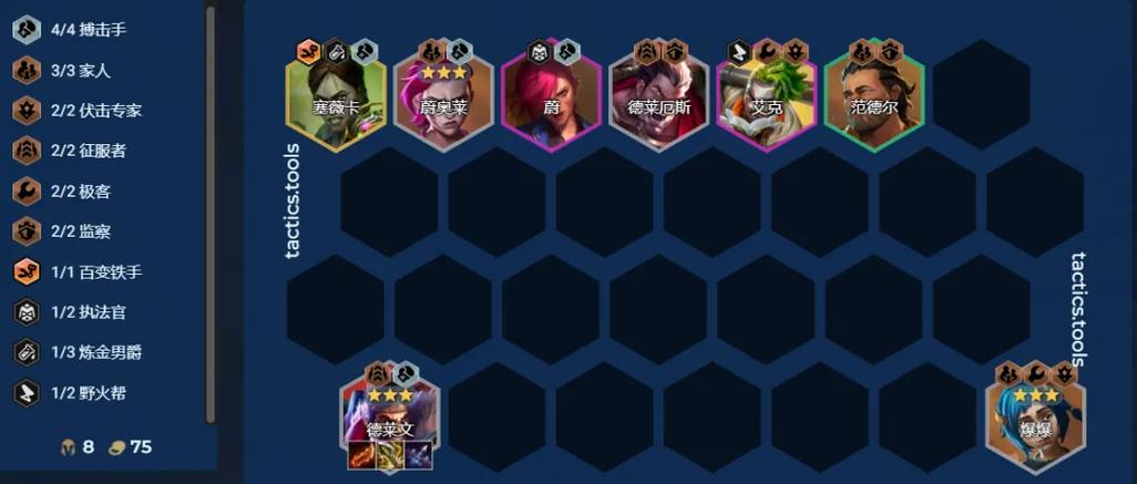 〖Two〗、阵容:蛮王、德莱文、蔚、狼人、卡莎、EZ、扎克、塔姆、猪妹。这个阵容以德莱文为核心输出,其他英雄则提供控制和坦度,确保德莱文能够安全输出。羁绊:4格斗家、4挑战者、3炼金科技、2执法官、1宿敌、1食神。这些羁绊能够大幅提升德莱文的攻击力和生存能力,同时增加团队的整体战斗力。