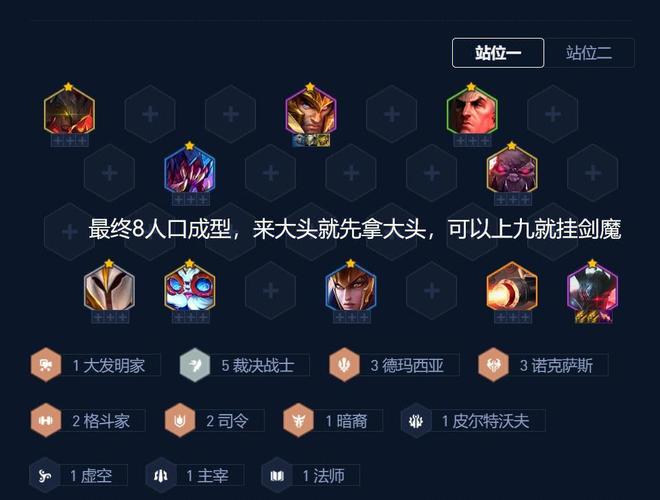 阵容由4裁决、2司令、3德玛、1暗裔、2主宰和3诺克组成,7人口时,天使、乌鸦、铁男、皇子、奎因、挖掘者和诺手能够提供稳定的苟分能力。若拥有裁决转职,可将挖掘机换成沙皇。在8人口时,优先构建6裁决,同时挂沙皇辅助。关键点在于根据血量和同行的情况判断启动时间。