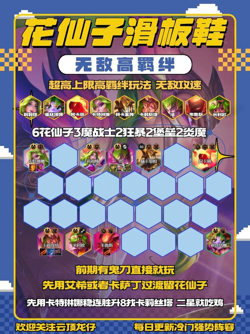 后期阵容可以按照缺失羁绊来补弈子。比如缺输出可以搭配一个卡尔玛来开出咒术师羁绊。缺坦度和控制可以搭配一下塔姆开重装战士羁绊。格温和菲奥娜也是可以搭配出狂暴战士羁绊。装备搭配 其实主要就是召唤物产生伤害的,装备的话就有啥用啥,大家要是有铲子,那么是可以和斗篷合成出魔神使者纹章的。