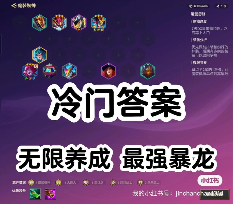 核心:男刀,坦克为雷欧娜。装备:男刀选取无尽和火炮,雷欧娜穿戴肉装。爆杀流蔚阵容:核心:蔚。装备:蔚穿戴蓝buff或青龙刀,以及科技枪。赏金阵容:特点:赌狗阵容,后期羁绊无敌。老鼠阵容:核心:射手,五发明家羁绊。特点:输出强力,坦度适中,均衡阵容。刀妹爆杀流阵容:核心:刀妹。