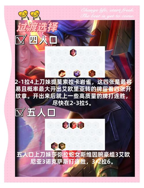 实战运营方面,1-4的野怪环节可以利用鳄鱼或刀妹单挑野怪吃利息。2阶段可以选取空城吃5连败,2-6输掉后留牌打野怪。3阶段则卡着利息拉人口,不用继续刻意连败,正常上阵容尽量多换怪。