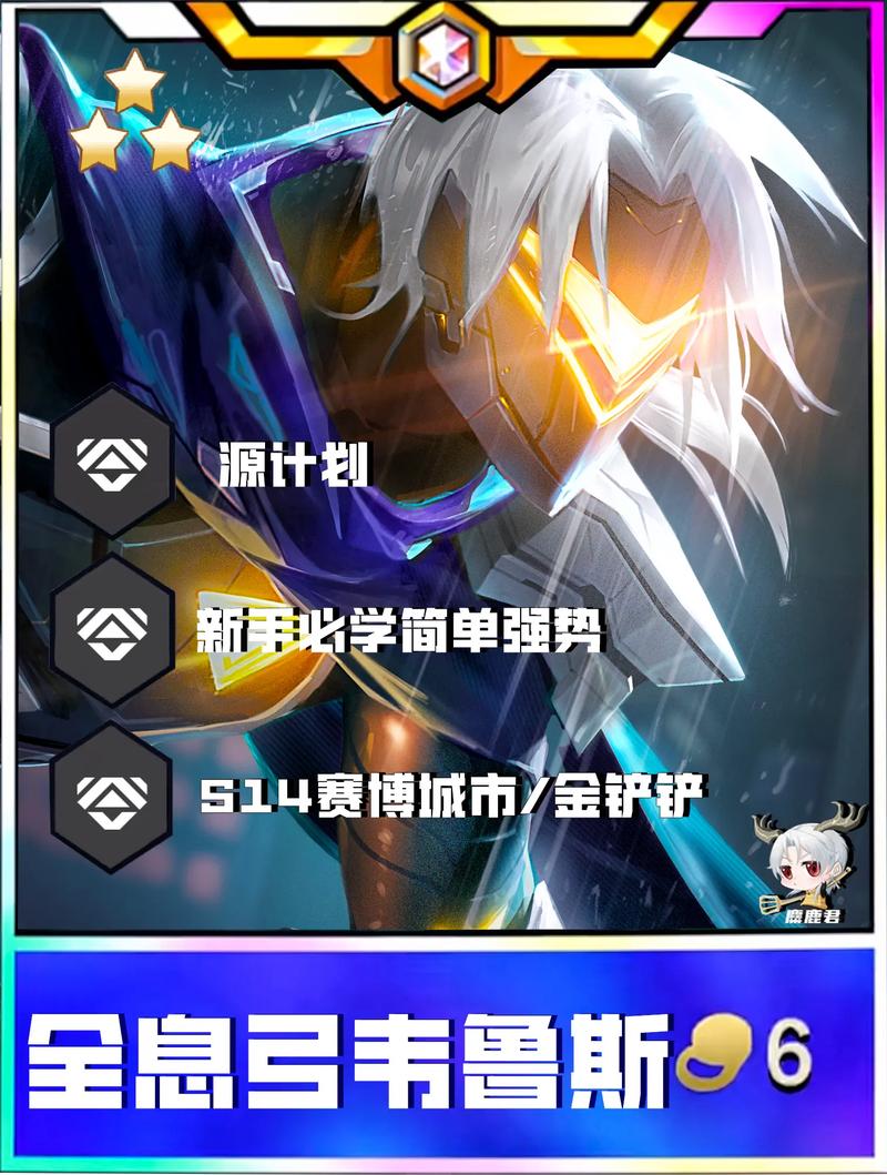 〖One〗、金铲铲之战S14惩戒之箭韦鲁斯技能介绍:弈子定位:韦鲁斯作为三费弈子,在S14赛季赛博之城中登场,拥有源计划和裁决使两大羁绊。技能名称:恶意软件锁链 技能效果:韦鲁斯发射一条锁链,对命中的首个目标造成高额的魔法伤害(200%/300%/480%法术强度)并使其晕眩1秒。