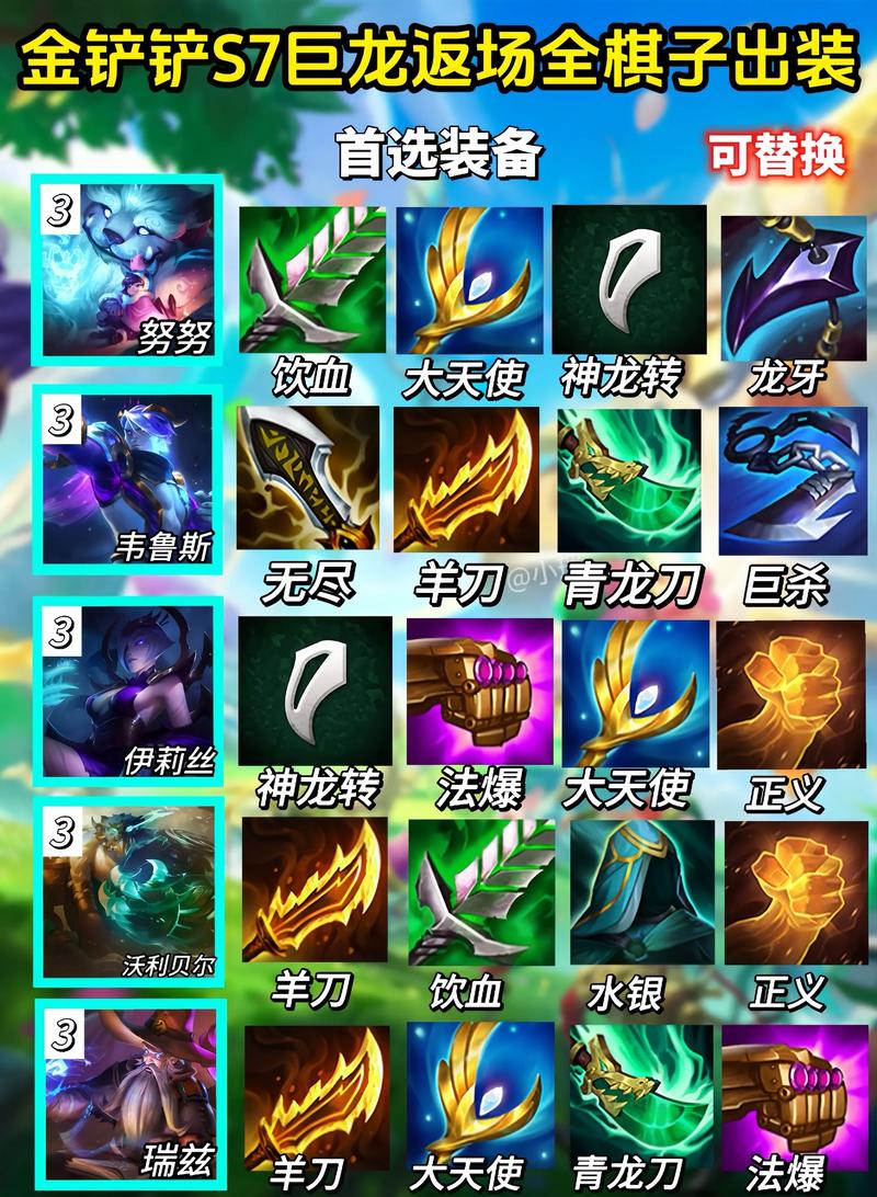 《金铲铲之战》S7巨龙之巢幽影刺阵容搭配及运营攻略 阵容组成核心成员为男刀(泰隆)、赛芬、琪亚娜、奥恩、皎月(黛安娜)、巴德、派克。该阵容以4幽影龙+4刺客+2风暴龙+2格斗家为核心羁绊,利用幽影龙的破甲效果与刺客的高爆发输出,快速击杀敌方后排。