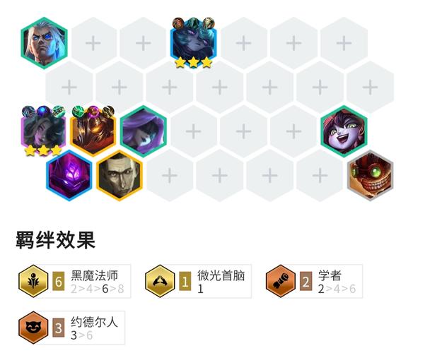 首先,尝试构建一个6黑魔法师、3辛迪加和2学者的阵容。在游戏初期,利用3约德尔人和2黑魔法师的组合进行打工,阿狸的装备可以优先给炸弹人使用。当到达4-1阶段,立刻升级人口到7,开始提升阵容的整体质量。在这个过程中,要注重阿狸的金币积累,为后期的阵容提升做准备。