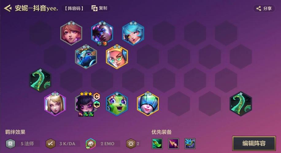 〖Two〗、一费卡:奎桑提、莉莉娅二费卡:盖伦、萨勒芬妮三费卡:莫德凯撒、艾克四费卡:阿狸、布里茨五费卡:娑娜主要羁绊:6秘术护卫3法师3KDA装备推荐:主C阿狸:蓝buff或朔极之矛必备,第二件优先科技枪,第三件法系输出装(如纳什之牙)。主坦布里茨:离子火花和通用肉装(如狂徒、坚定之心、冠冕)。