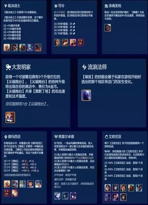 羁绊棋子:斯莫德、克格莫、璐璐、拉莫斯。战斗学院:效果:战斗学院弈子们升级其技能并获得潜能,潜能可改进其技能。羁绊棋子:蕾欧娜、悠米、杰斯、凯特琳、卡特琳娜、盖伦、伊泽瑞尔。此外,还有霸天机甲(暂译)等羁绊,具体效果可能以游戏内实际体验为准。