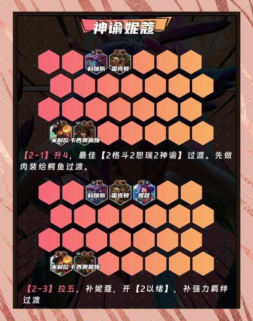 〖One〗、在《金铲铲之战》S5版本中,以下阵容具备较强竞争力:主宰尼菈核心为6主宰羁绊,需主宰文章纹章支持。尼菈必做火炮,沙皇副C需纳什之牙+法爆,狗头携带薄暮法袍提升尼菈输出。过渡依赖2主宰2挑战2祖安,打工核心为金克丝+狼人+莎弥拉,优先连胜。崔斯特传说之力强化装备获取,城邦优先选经济类。