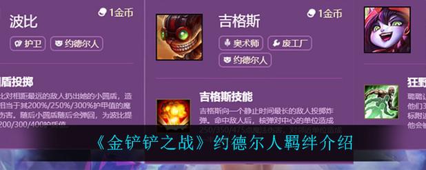 约德尔人:在每次对玩家的战斗之后,1名随机的约德尔人会被免费添加到你的备战席中。6约德尔人:除了上述效果外,约德尔人们的技能消耗会降低20%。角色介绍 1费卡:吉格斯:炸弹人,拥有高爆发技能,适合作为前期输出点。波比:拥有护盾和控制技能,可以提升团队的生存能力。