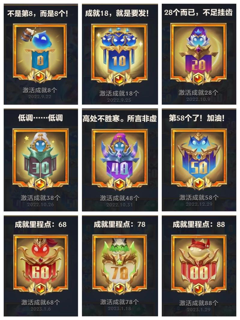 〖Two〗、英雄成就汇总:金闪闪的快乐:单人排位模式上阵至少一名3星橙卡并且获得第一名。(紫色成就)多多益善:匹配/排位模式至少10人口并且获得第一名。(紫色成就)预留了容错但没用上:排位模式130点的血量获得第一名。(紫色成就)满血第一:排位模式100点的血量获得第一名。