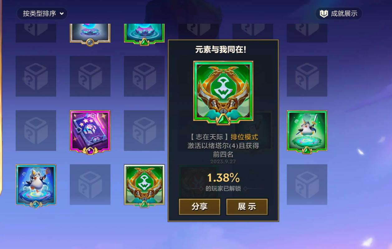 金闪闪的快乐:单人排位模式上阵至少一名3星橙卡并且获得第一名。(紫色成就)多多益善:匹配/排位模式至少10人口并且获得第一名。(紫色成就)预留了容错但没用上:排位模式130点的血量获得第一名。(紫色成就)满血第一:排位模式100点的血量获得第一名。