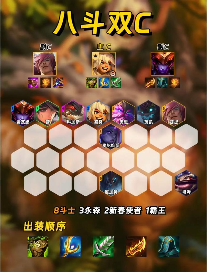 月神猎:该阵容以月神为核心,搭配猎人羁绊,拥有强大的输出能力和生存能力。通过合理的装备分配和技能选取,可以轻松应对各种敌人。赌提莫:这是一套非常强势的阵容,拥有极高的前四率和吃鸡率。提莫的隐身和毒蘑菇技能让敌人难以捉摸,配合其他英雄的控制和输出,可以迅速击败对手。