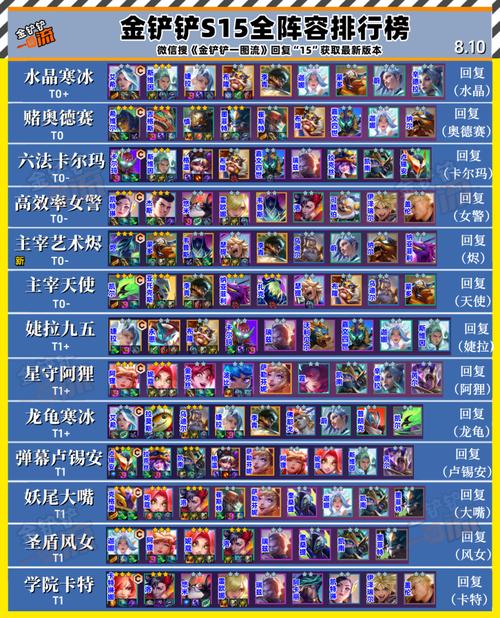 〖Three〗、金铲铲之战S15赛季推荐的上分阵容有机甲4宗师阵容、格温永恩95阵容、逐梦奥德赛阵容、圣盾狙神阵容以及至高天九五阵容。机甲4宗师阵容:特点:该阵容在新赛季上线前未被削弱,拥有长达4秒的锁蓝效果,可以很好地控制敌人,为队友创造输出环境。适用场景:适合在需要控制敌人以获取战斗优势的情况下使用。