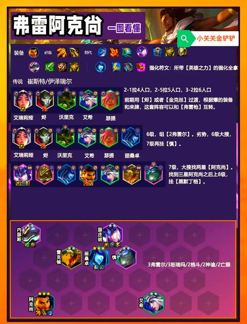 〖Four〗、金铲铲之战S9赛季强力阵容推荐:弗雷阿克尚阵容 核心思路:该阵容在阿克尚到来后实力显著提升,因此前期需耐心等待阿克尚的加入。关键操作:在阿克尚未到来前,注意控制血线,避免过早被淘汰。必要时,可以通过梭哈来寻找二星阿克尚以锁血,提升阵容实力。