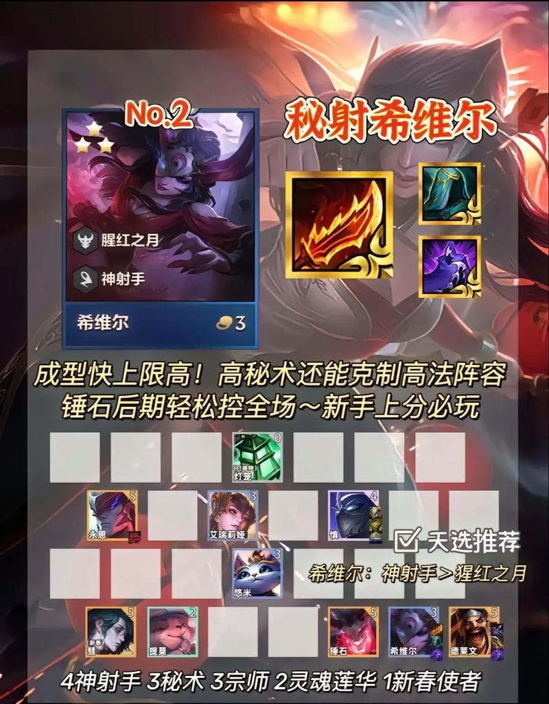 阵容核心思路 利用福星羁绊:天神狼人主C阵容的关键在于充分利用福星羁绊提供的经济优势,通过额外金币收益来更早地刷新出高质量英雄,确保阵容成型速度。前期过渡 选取三星打工仔:在前期,建议使用三星英雄如VN或锐雯来过渡,确保血量健康,为后续阵容成型打下基础。
