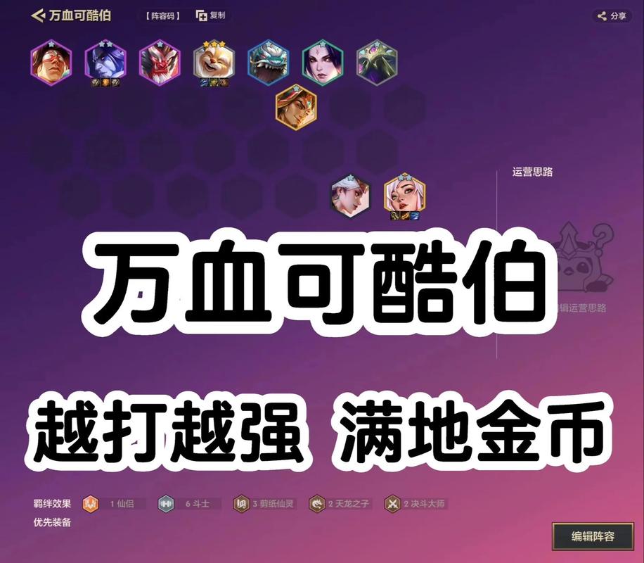 〖Six〗、适配阵容:飞升护符可酷伯在【传奇英雄】、【幸运爪】、【灵魂虹吸】、【急落怒放】和【天将】等阵容中都能发挥出色的作用。这些阵容往往以战士或坦克为核心,飞升护符能够进一步提升这些棋子的战斗力。玩法建议 装备选取:由于飞升护符占用一个装备格子,更适合高坦度但缺少输出的棋子。