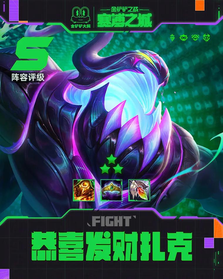 〖Five〗、装备推荐:可酷伯:羊刀(提供攻速加成,增强持续输出能力)、饮血(增加吸血效果,提升生存能力)、泰坦(提供额外的生命值和攻击加成)。小法:鬼书(提供法术穿透和重伤效果,对敌方后排造成威胁)。后期成型阵容 阵容组成:盖伦、扎克、阿萝拉、可酷伯、佛耶戈、鳄鱼、牛头、波比、莫甘娜。