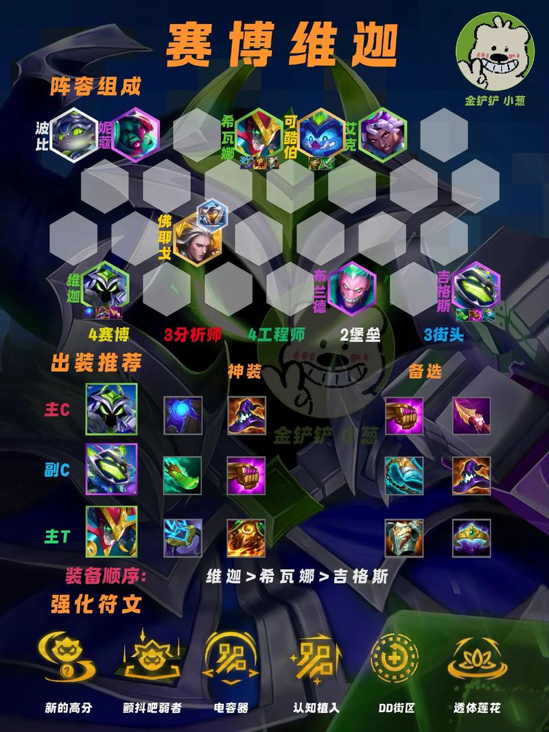 《金铲铲之战》S5最强阵容玩法攻略 黑客德莱文阵容组成:布里茨、孙悟空、德莱文、慎、乐芙兰、贾克斯、卡蜜尔/盖伦、沃里克/蕾欧娜核心思路:以德莱文为核心输出,搭配高AI或战斗机甲羁绊提升上限。