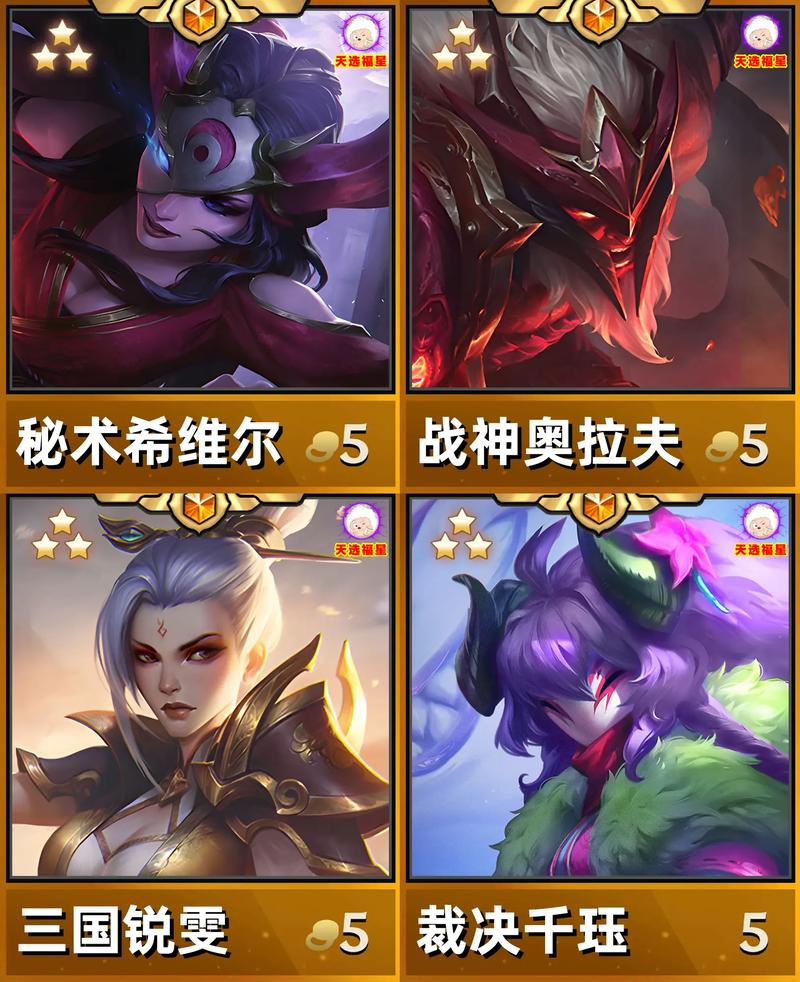 永恩瑟提蔚派克赵信卡特皇子(嘉文四世)沙皇(阿兹尔)核心思路:在天选福星版本中,三国阵容以其高血量与高法强的特性成为非常强势的选取。该阵容主要依赖卡特琳娜在前中期打爆发输出,而后期则依靠瑟提的极高爆发伤害来主宰战场。天选推荐:优先寻找三国天选或卡特天选。