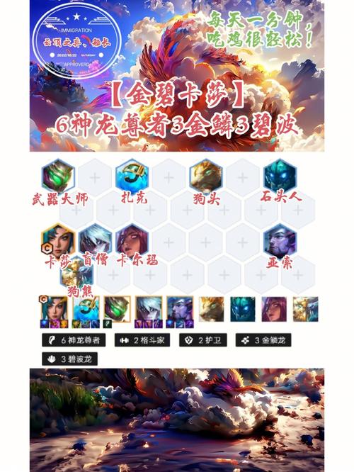 金铲铲s5金鳞龙卡莎阵容,强势且成型速度快。核心成员卡莎、贾克斯、扎克、狗头、狗熊、石头人、盲僧、亚索,共同构筑强大羁绊。四神龙尊者、三碧波龙、三金鳞龙、二护卫、二格斗,羁绊效果显著,提供全面优势。卡莎装备推荐:蓝霸符/青龙刀、无尽、法爆、大帽、巨杀、正义、饮血等,确保高额输出。