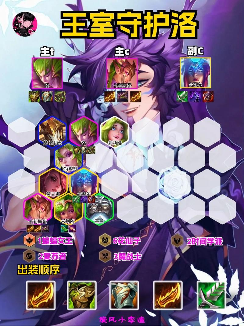 在7花仙子阵容中,关键弈子包括莉莉娅、萨勒芬妮、阿卡丽、卡特琳娜、赫卡里姆、洛、卡莉斯塔、米利欧和莫甘娜。这些弈子之间形成的羁绊是7花仙子、3魔战士、2堡垒卫士、2复苏者和2狂暴战士。这种配置使得阵容在攻击、防御和辅助治疗方面都有出色的表现。