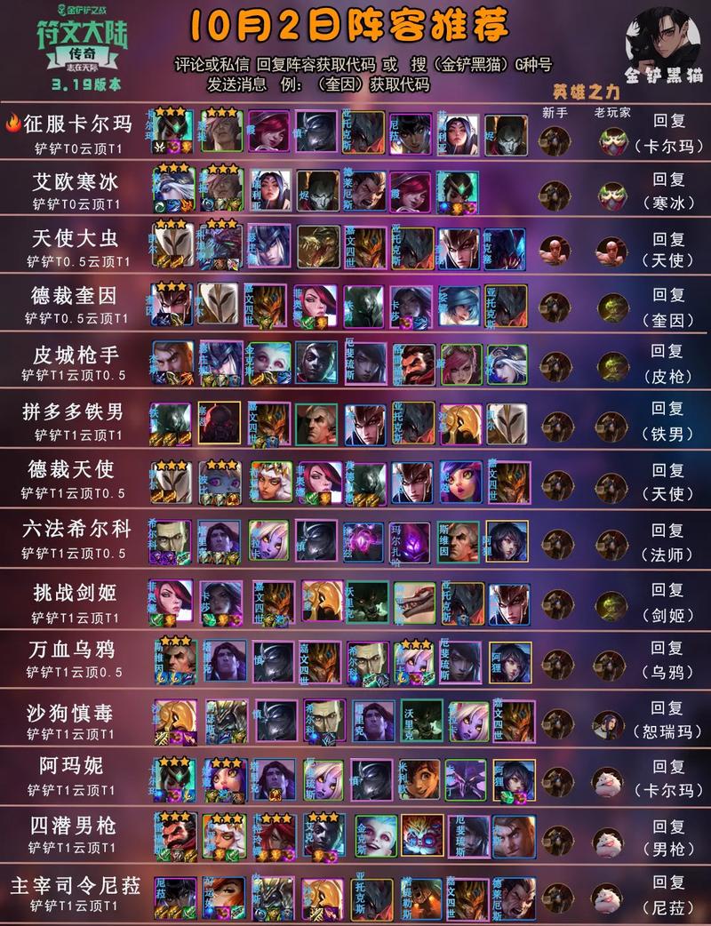 金铲铲之战s12命运95阵容的玩法如下:阵容组成 英雄:泽拉斯、贝蕾亚、莫甘娜、丁真、洛、皎月、塔姆、人马、妮蔻。羁绊:1飞升者、1蝙蝠女王、1狂厄蔷薇、4命运、2花仙、2女巫、2堡垒、2复苏、2学者、2换形。装备选取 根据英雄的技能和定位,选取合适的装备进行搭配。