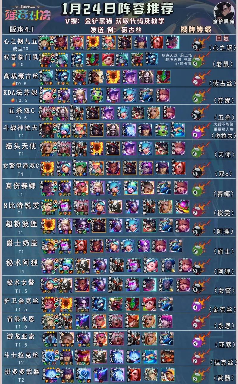 阵容组成:永恩、刀妹、武器、盲僧、肾、猫、霞、千珏、天使。阵容强度:成型必吃分,质量够高能吃鸡。核心装备:羊刀、火炮、旗子(千珏/霞)运营思路:①弓开局的话尽量走连胜,装备不需要抢的情况下。②开局可以三国豹女带装备,也可以看天选走。