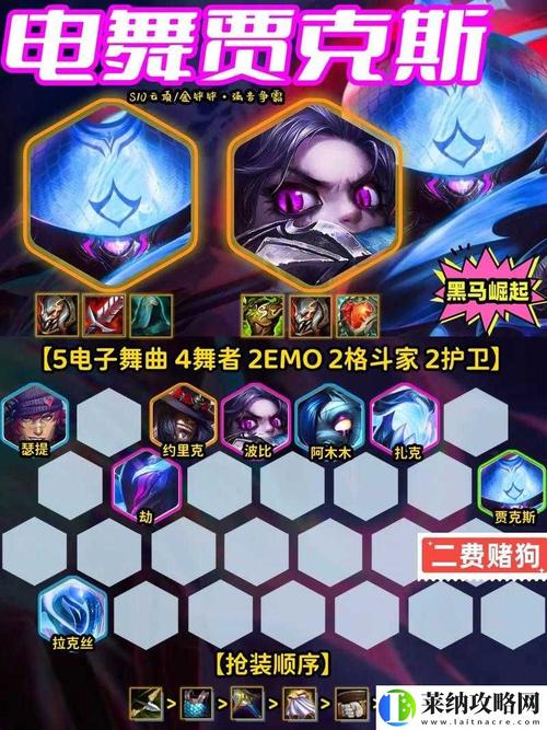 核心羁绊:电子舞曲『4』、舞者『4』、格斗家『2』、耀光使『2』。关键英雄:拉克丝(必须三星,作为阵容的主要输出点)、扎克(三星后坦度极高,提供关键控制)、瑟提(三星后输出能力惊人)。