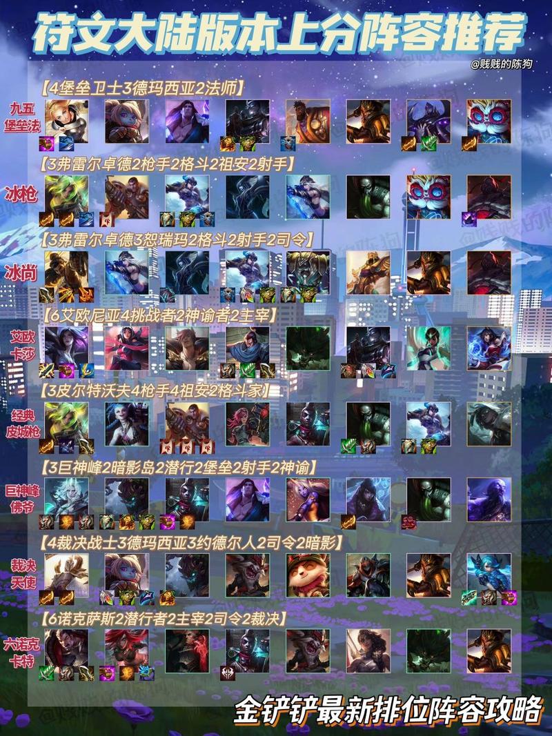〖Six〗、今天为大家推荐几个金铲铲之战黎明不错的上分阵容搭配推荐。重骑破败女枪 阵容需要角色:锤石,泰坦,猪妹,人马,女枪,铁骑,德莱文,努努,其中主C是女枪,副C是人马。女枪和人马是关键角色,装备三件套满上,星级达到三星,基本稳拿第一。