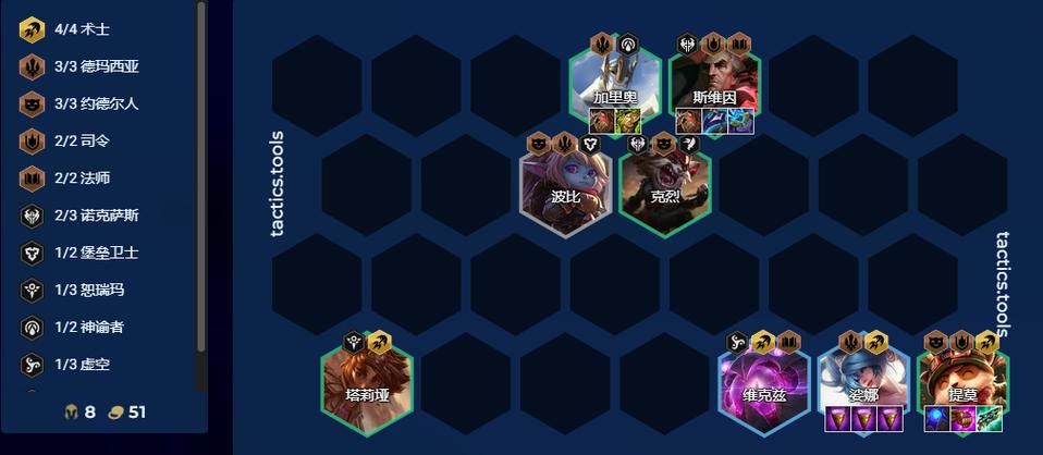 〖Five〗、在金铲铲s9的新赛季中,推荐的阵容包括提莫、塔莉垭、加里奥、琴女、斯维因、维克兹、大头和波比,构成羁绊为4术士、3德玛、3约德尔和2法师。这样的搭配可以发挥各英雄的特色技能,形成强大的控制和输出效果。对于强化符文的选取,优先考虑潘多拉的装备、潘多拉的备战席和投资收益。