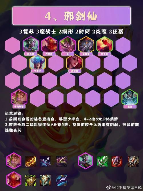 〖One〗、炎魔枪手阵容:以炎魔枪手为核心,这个阵容能够在前期就建立起优势。韦鲁斯和斯莫德是阵容中的关键英雄,他们的装备选取和星级提升都至关重要。狂暴尼菈阵容:尼菈作为核心输出,能够持续造成高额伤害。在前期,你可以尝试在6人口时慢搜尼菈和阿卡丽的3星,一旦达成,便可以开始提升人口并完善阵容。