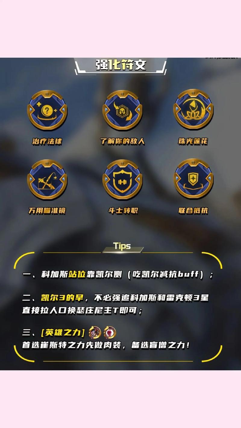 终极伊泽瑞尔、铁男、艾克、风女、稻草人、蕾欧娜、螃蟹、努努和伊泽瑞尔,这是推荐的阵容组合,也就是所谓的魔盗转五费阵容。这样的搭配可以在游戏过程中提供强大的战斗力和生存能力。强化符文的选取上,动态防御、高端购物、地下魔盗团之心是优先选取的。