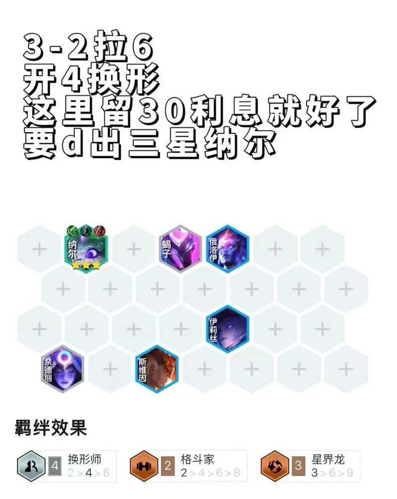 狂野龙法阵容核心棋子:龙女(主C)、龙王、纳尔、豹女、狼人、狐狸、猴子。羁绊效果:4狂野(全体攻击无miss且攻速叠加)+3换形师(变形后血量提升)+3法师(技能伤害提升)。运营思路:前期用狂野棋子过渡,优先抢反曲弓、大棒合成羊刀、科技枪等装备给龙女。