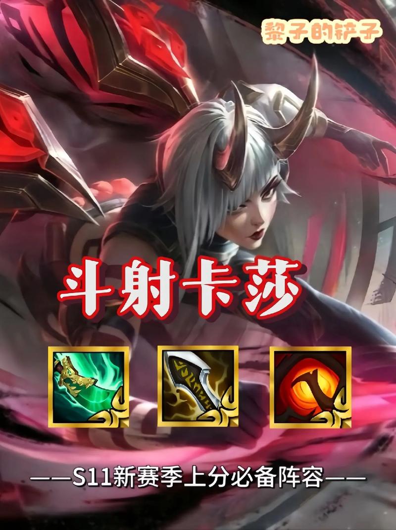 〖Three〗、金铲铲之战S11新赛季上分阵容推荐—斗射卡莎 阵容组成:主C卡莎、主坦加里奥、轮子妈、提莫、剑魔、瑞文、赛拉斯、霞、乌迪尔,组成四斗四射三剪纸的羁绊。装备推荐:主C卡莎:无尽之刃、红buff必备。