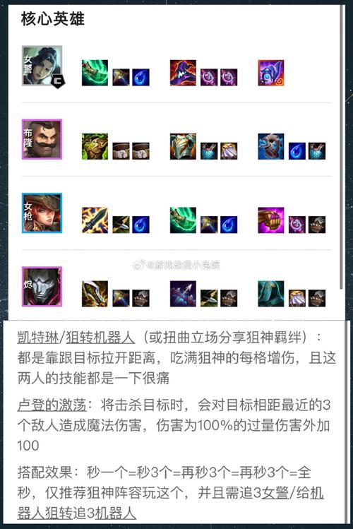 〖Two〗、在《金铲铲之战》双城之战模式中,有几种阵容被认为是当前版本最强的,具体如下:阵容一:圣盾大嘴大嘴作为核心输出角色,推荐装备为羊刀、巨杀和水银。羊刀和巨杀是必备装备,以提高其输出能力。盖伦作为副C角色,不仅能充当前排坦克,还能在残局时进行收割。装备建议以肉装和回复装为主。