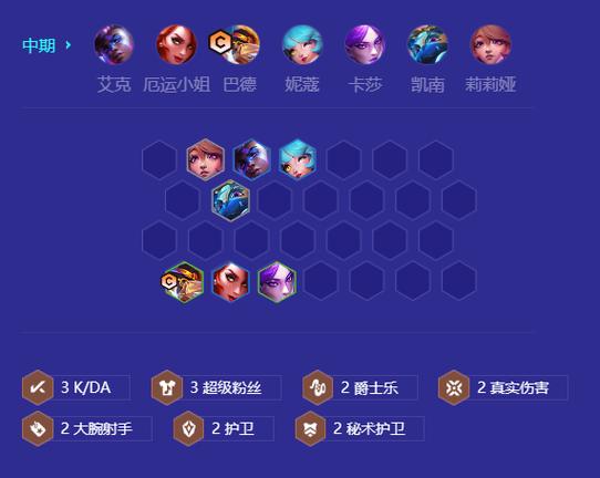 〖Three〗、天选找女枪的任意天选就行,大腕射手可以少个烬九级成型,如果是爵士乐就能多一个加成,再拿到转职就更加厉害。4人口,前期任意天选打工即可,这套近来就是利用3法师3KDA3粉丝羁绊过渡,利用萨勒芬妮前期带女枪装备打工,所以羊刀前期可以早做方便过渡,也能后期给到女枪。