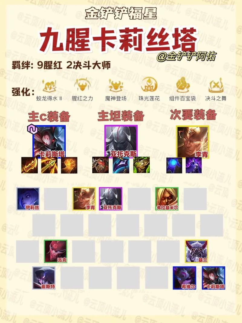 - **阵容前提**:前期优先拥有决斗天选的亚索或卡莉斯塔。装备方面:- **主C**:凯尔,装备推荐为“疾射火炮”(反曲弓+反曲弓)、“鬼索的狂暴之刃”(反曲弓+无用大棒)、“正义之手”(拳套+女神之泪)。