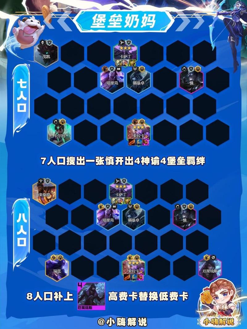 阵容分析:前期尽量用强势棋子与羁绊打工,保证打工棋子2星,确保血量的健康,7与8阶段开始转型,找核心卡。『2』阵容主要由以下羁绊组成。『3』海克斯:优先海克斯转职和粉碎器,没有的话续航类、经济类也可以考虑。