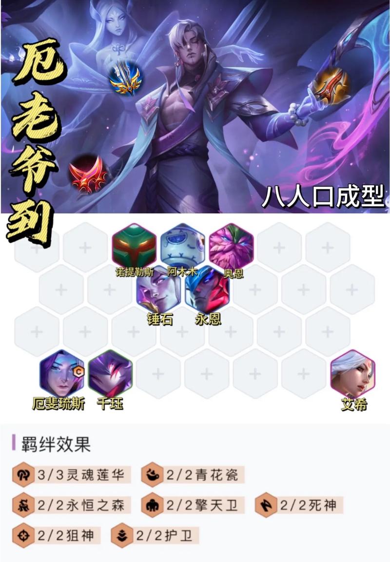 〖One〗、连线连锤石和瑟提,图中默认为无转职的配置,如果有一个灵魂莲华转职给到奥恩,则阿狸改为丽桑卓、或亚索改为阿木木,厄斐琉斯和锤石成对角线站。推荐用莲华亚索,后排随便上个莲华棋子带鬼索的狂暴之刃,后面转给厄斐琉斯带,有5莲华优先开5莲华。