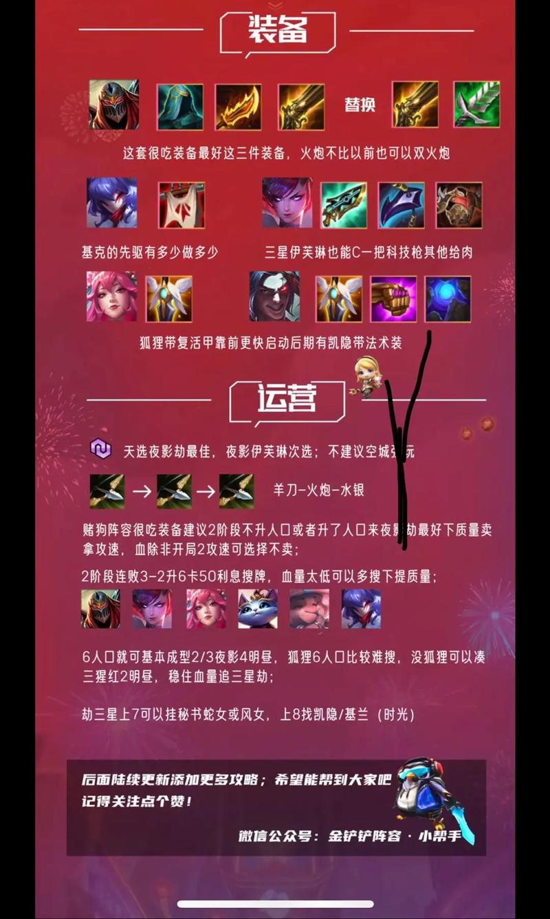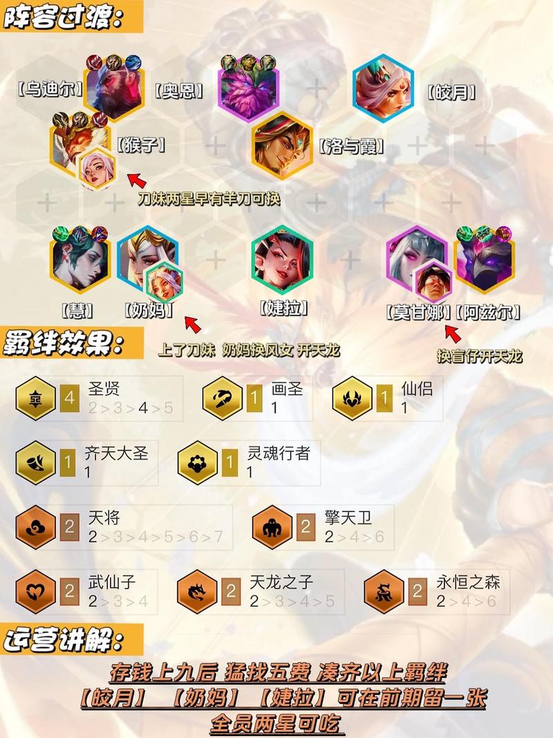 阵容组成:永恩、刀妹、武器、盲僧、肾、猫、霞、千珏、天使。阵容强度:成型必吃分,质量够高能吃鸡。核心装备:羊刀、火炮、旗子(千珏/霞)运营思路:①弓开局的话尽量走连胜,装备不需要抢的情况下。②开局可以三国豹女带装备,也可以看天选走。