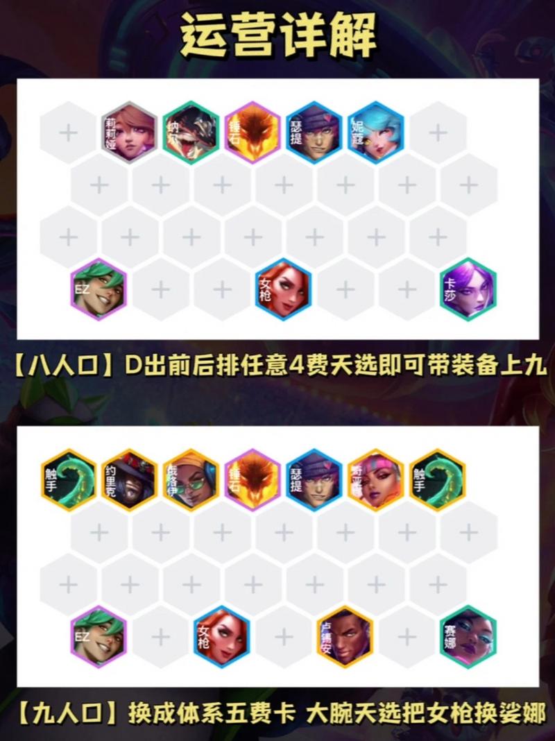 〖Two〗、开局抢水滴,胡ez玩这套,不胡就去玩法师。1ez的核心装备是大天使,科技枪,多出的水滴可以是电刀,蓝buff或救赎。12阶段不上人口,有质量就正常过渡保血。用2射手2护卫过渡即可。1正常情况3-1卡着4人口先大搜一波,3阶段只要宝石、日女、ez任一三星就可以存钱,5级卡着搜追三星。