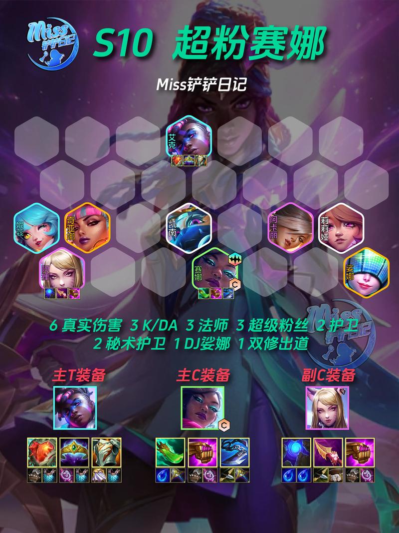 〖Four〗、阵容组成包括凯南、蔚、潘森、妮蔻、锤石、金克丝、赛娜。在7人口时达到最佳阵容,若条件允许,可补充2星高费卡,或开启6护卫/4枪手羁绊。核心羁绊为4护卫4朋克2枪手。优先考虑转职为护卫纹章或疾射枪手纹章。金克丝作为主C,装备推荐无尽之刃+最后的轻语,最后一件装备可选取羊刀增加续航或巨杀提升伤害。